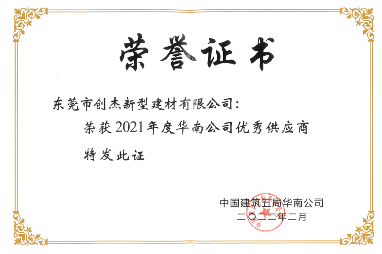 近月,東莞市創(chuàng)杰新型建材有限公司連續(xù)斬獲兩項榮譽——在中國建筑第二工程局有限公司東莞分公司2021年度供應(yīng)商評估中被授予“攻堅克難獎”,獲評中國建筑五局華南公司“2021年度優(yōu)秀供應(yīng)商”稱號。