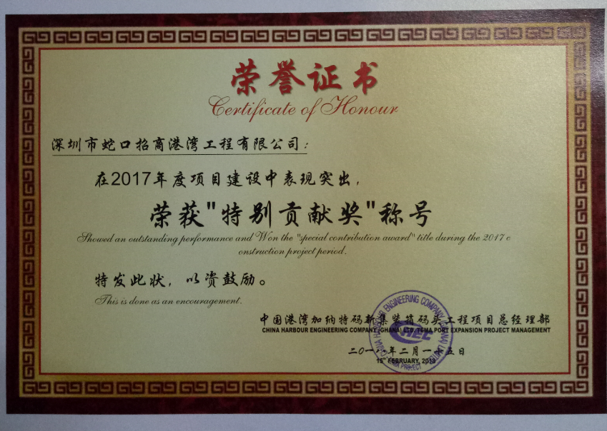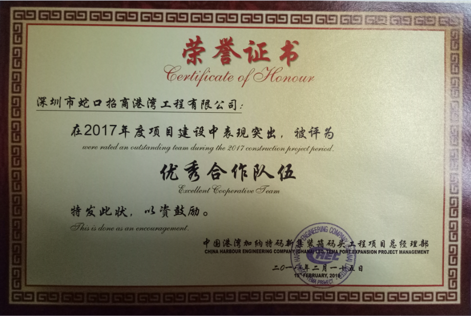 簡(jiǎn)訊 近日,中國(guó)港灣總經(jīng)理部對(duì)所有合作隊(duì)伍進(jìn)行了全面考評(píng),招商建設(shè)國(guó)際有限公司加納項(xiàng)目部獲得“特別貢獻(xiàn)獎(jiǎng)”和“優(yōu)秀合作隊(duì)伍”榮譽(yù)稱號(hào),并獲得總項(xiàng)目部5.5萬(wàn)塞地幣的物質(zhì)獎(jiǎng)勵(lì)。中國(guó)港灣加納特馬新集裝箱碼頭工程項(xiàng)目總經(jīng)理部總經(jīng)理?xiàng)罱_為招港國(guó)際加納項(xiàng)目部頒發(fā)榮譽(yù)證書(shū),并寄語(yǔ)招港國(guó)際加納項(xiàng)目部2018年繼續(xù)發(fā)揚(yáng)優(yōu)良風(fēng)格,發(fā)揮優(yōu)勢(shì),爭(zhēng)取更好的成績(jī)。