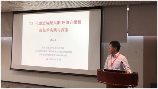 深圳市蛇口招商港灣工程有限公司特聘首席專家、產(chǎn)學(xué)研合作單位重慶交通大學(xué)周志祥博士應(yīng)邀主持了5月10日上午“橋梁及道路工程主體論壇”,并做了《工廠化建造裝配式鋼-砼組合橋梁新技術(shù)實踐與探索》的特邀報告,介紹了基于汽車制造理念探索全工廠化建造鋼-砼組合橋梁的結(jié)構(gòu)、技術(shù)與裝備的部分研究及實踐工作。其創(chuàng)新探索精神受到與會代表的熱議和贊揚,會后數(shù)位代表主動與周志祥博士進行進一步的交流和探討。