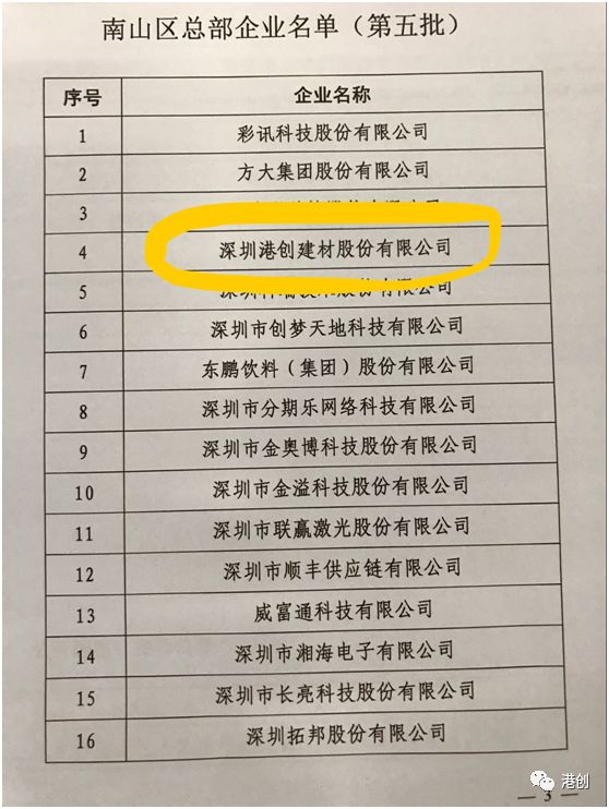 深圳港創(chuàng)建材股份有限公司榮獲第五批“南山區(qū)總部企業(yè)”榮譽稱號